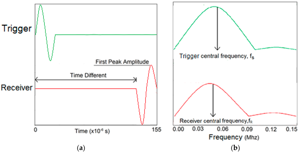 Figure 9a is an example of time domain data for a trigger and a receiver as simulated. The time difference between excitation from trigger and wave arrival at the receiver is distinguishable. The time domain data was converted to frequency domain by fast Fourier transform (FFT), yielding the amplitude spectrum of the waves as shown in Figure 9b. The centroid frequency and variance could be computed from the amplitude spectrum.