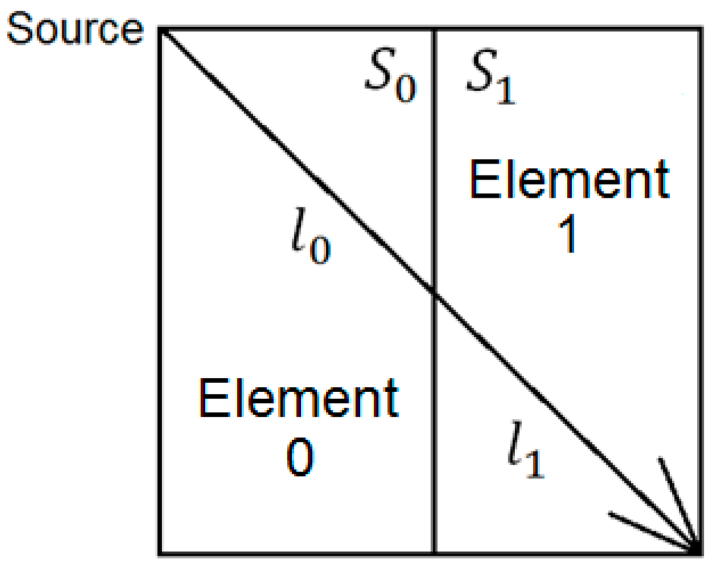 in which l represents the ray path of the ray in element “0”. For occasions where there is more than one ray passing through that element, Equation (14) has to be modified to address the change of attenuation coefficient at element number j as below