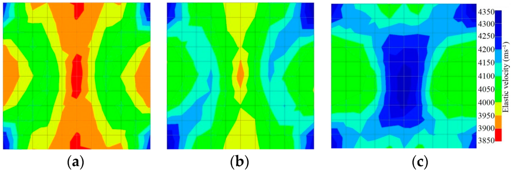 Figure 12. Travel time tomography results of of honeycomed concrete model based on measurements using a 2-sided sensor arrangement: (a) 0%; (b) 50%; and (c) 100% grout filling.