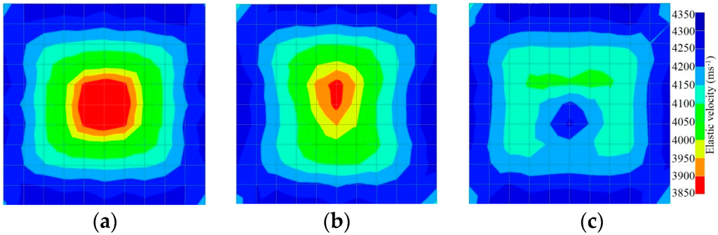Figure 11. Travel time tomography results of honeycombed concrete model based on measurements using a 2-sided sensor arrangement: (a) 0%; (b) 50%; and (c) 100% grout filling.