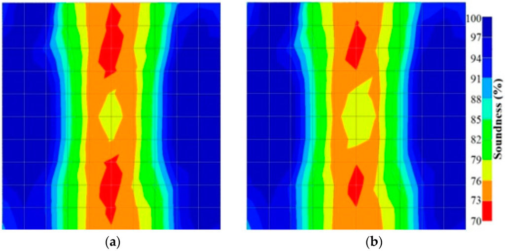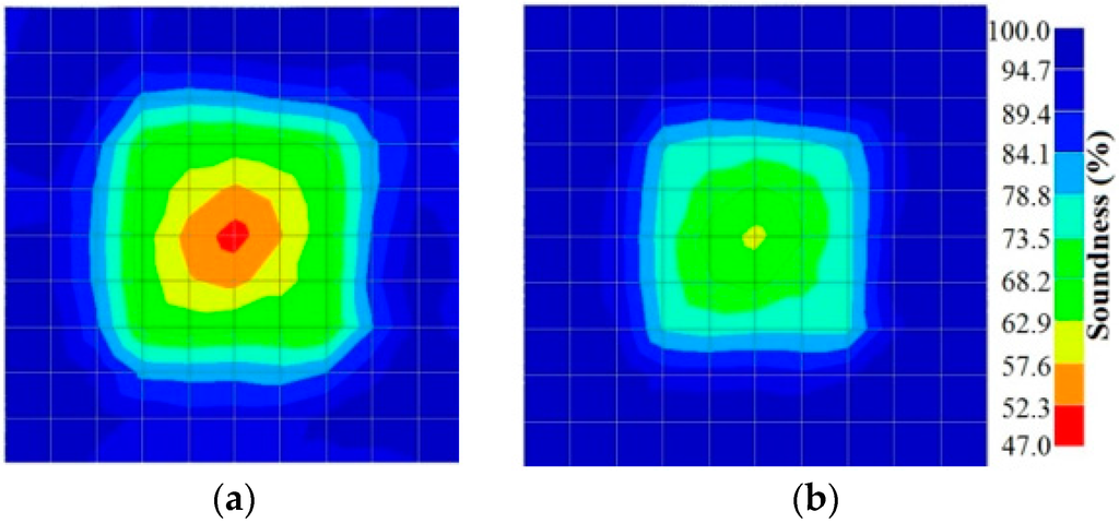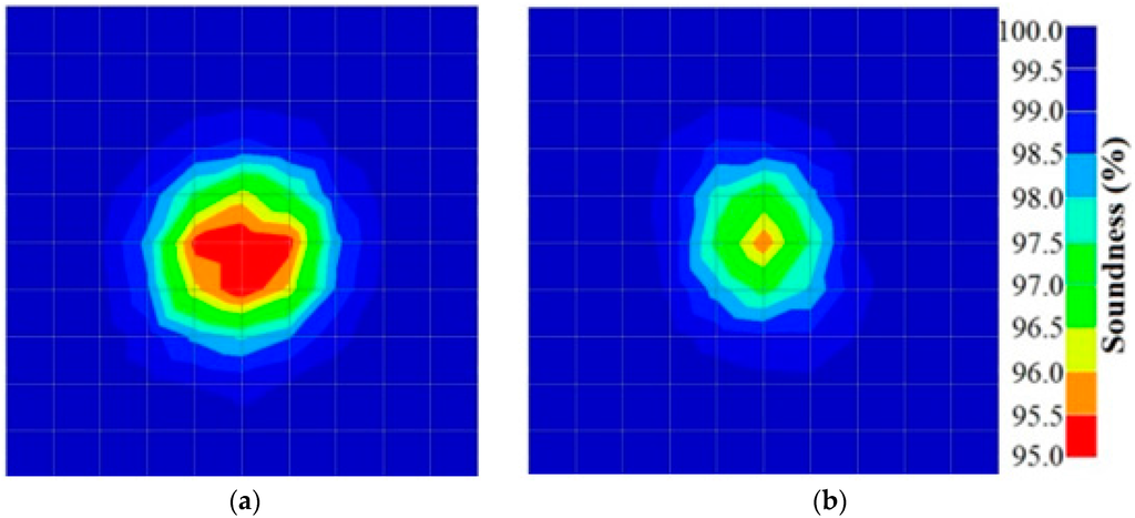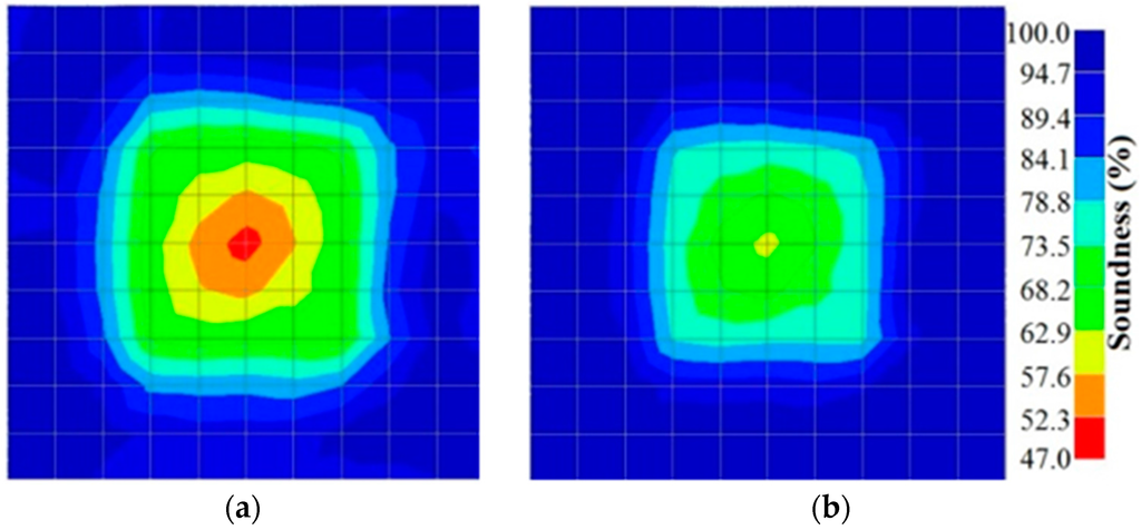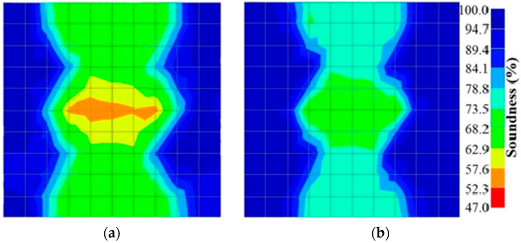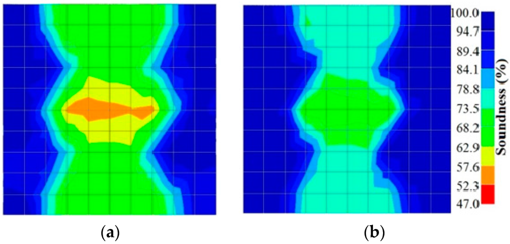Figure 14. Soundness of grout filling in the concrete model based on amplitude tomography results of the 4-sided sensor arrangement: (a) 0% and (b) 50% fillings.