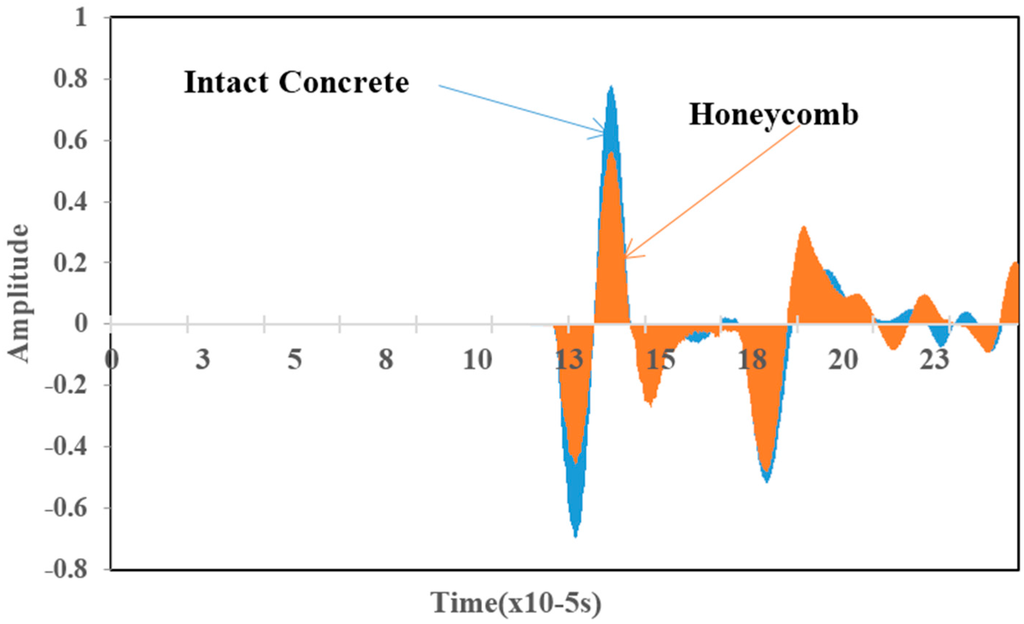 Figure 20 is an example of time domain wave data of amplitude vs. time for waves that propagates in two types of medium: intact concrete and concrete with honeycomb. Figure 20 shows that the amplitude of the wave propagated in concrete with honeycomb is lower than in intact concrete. Besides, Figure 20 demonstrates that waves in intact concrete reached the sensor earlier than waves that were propagated in concrete with honeycomb.