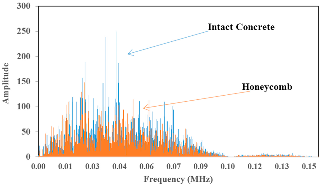 Figure 21 is a graph of amplitude vs. frequency for a wave that propagates in two types of medium: intact concrete and concrete with honeycomb. Figure 21 illustrates that the graph is shifted to the right for intact concrete compared to concrete with honeycomb. In Figure 21, the standard deviation of the wave propagated in sound concrete was recorded as 30.02 for amplitude and 0.052 MHz for frequency measurements while for concrete with honeycomb, the registered values were 22.93 and 0.048 MHz for amplitude and frequency, respectively. Thus, the results show that the wave experienced reflection in concrete with honeycomb and some part of the energy was transformed to another form so that the amplitude and frequency that the sensor received for concrete with honeycomb were less than for intact concrete.