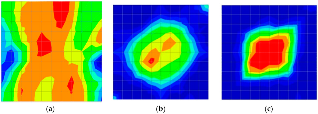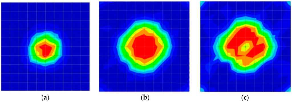Figure 11 and Figure 12 show tomography results of the PC model with 2-sided and 4-sided sensor attachments, respectively. It can be confirmed that the visualization to spot the 0% and 50% grout filling conditions was improved using a 4-sided sensor arrangement as shown in Figure 12a,b. For 100% grout filling, both the center of the 2- and 4-sided sensor attachments of the travel time technique showed a center with blue color as in Figure 11c and Figure 12c which indicates the efficiency of 100% filling of the duct with the grout can be visualized properly.
