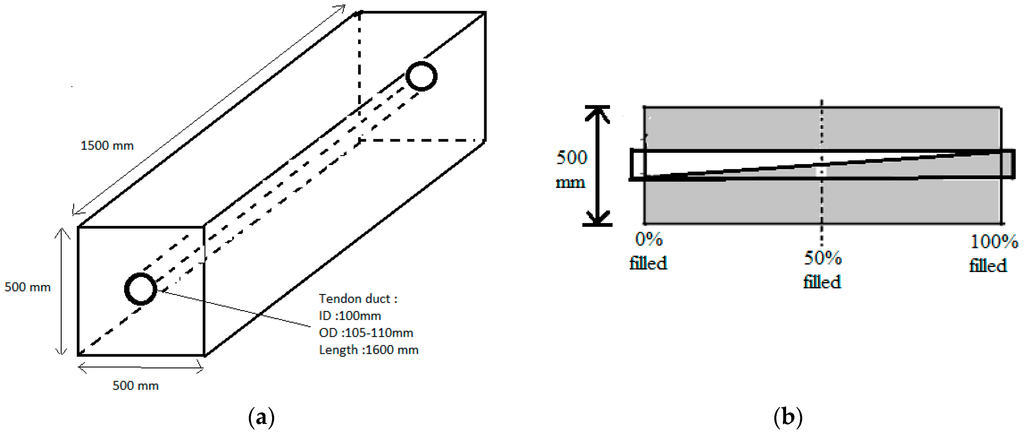 The next case study was a PC specimen which was prepared based on a design illustrated in Figure 23. Ultrasonic tomography was tested to detect the artificial defect in the cross section caused by a different percentage of void in the PC duct. This void was placed by using different percentages of cement grout as duct filler. The three grout percentages were 100%, 50%, and 0% which are in compliance with the simulated PC conditions in the numerical wave analysis. The pre-stressed tendon duct was a 1600 mm steel duct (ID: 100 mm, OD: 107 mm). The grout mix was designed in compliance with the ASTM C 476 requirement. The compressive strength of concrete was 55 MPa at 28 days.