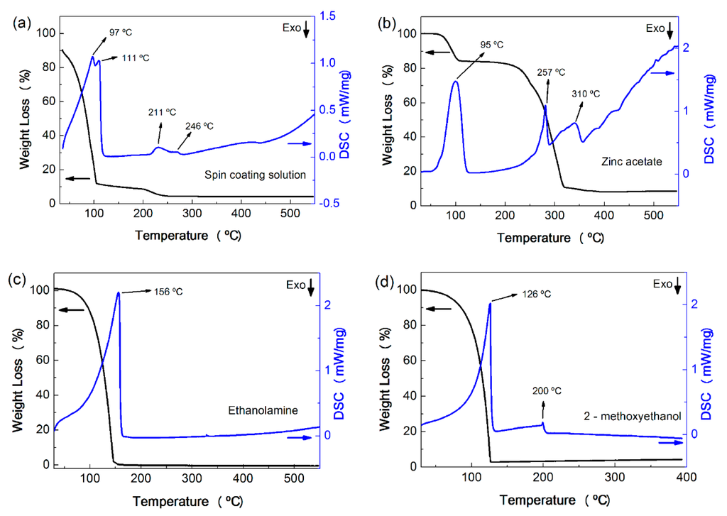 TG/DSC curves of the: (a) solution used in the formation of ZnO seed layer; (b) zinc acetate; (c) ethanolamine; and (d) 2-methoxyethanol.
