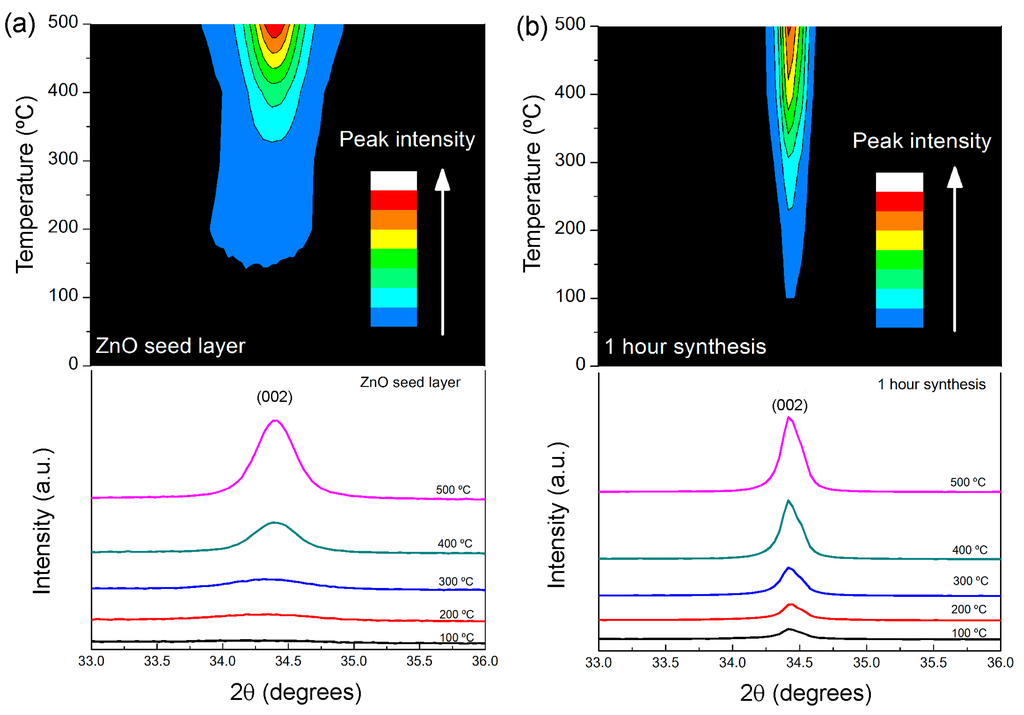 The peak intensity of the (002) plane is found to increase with increasing annealing temperature, for seed layer and nanorod arrays, indicating that the degree of crystal orientation, as well as grain sizes increased with the increase of annealing temperature. The low intensity of (002) diffraction peak of seed layer annealed at 100 °C indicates that the thin film is nearly amorphous. This latter result is in consonance with Ohyama [32], which reported that the use of 2-methoxiethanol and ethanolamine, with high boiling points, will produce strongly preferred orientated ZnO nanocrystals. Higher annealing temperatures ensured higher preferred orientation regarding the (002) plane, which can be associated to the structural relaxation of the gel film before crystallization. However, the growth of ZnO nanorod arrays on amorphous thin film (annealed at 100 °C) resulted in a highly crystalline ZnO nanorods, meaning that the amorphous ZnO seed layer does not limit the growth along the (002) plane [27].