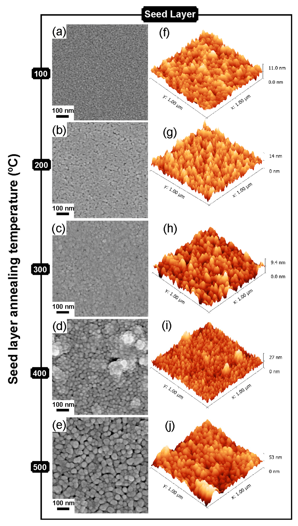 (a–e) SEM images; and (f–j) AFM images of ZnO seed layers produced with different annealing temperature (100 °C, 200 °C, 300 °C, 400 °C and 500 °C, respectively).