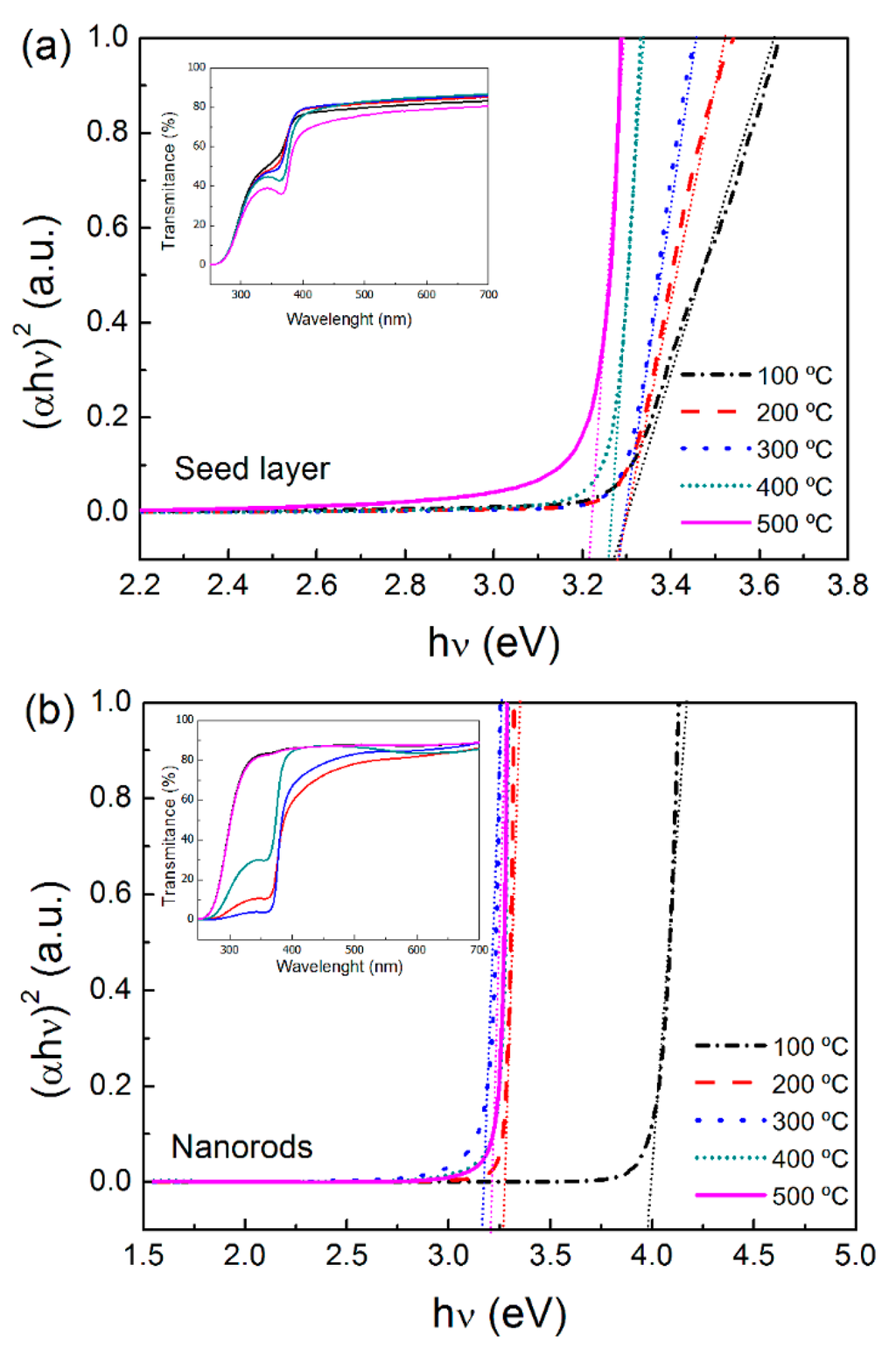 Band gap of: (a) ZnO seed layers at different annealing temperatures; and (b) ZnO nanorod arrays grown above these seed layers. The insets show the optical transmittance of the produced ZnO materials.