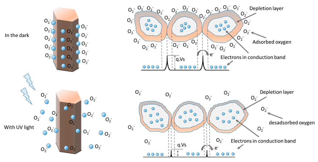 Ultraviolet (UV) is a high energy beam with photon energies varying from 3.0 to 12.4 eV (400–10 nm), which overlaps with the band gap of zinc oxide, around 3.4 eV [43]. The use of nanostructures for sensing applications have the advantage of a high surface area and electronic processes are strongly influenced by surface processes [13]. The sensing process is governed by the oxygen vacancies on the surface that influences the electronic properties of ZnO. Upon oxidation, with the adsorption of molecules containing a high concentration of O2 at vacancy sites that accept electrons, electrons are withdrawn and effectively depleted from the conduction band leading to reduction of conductivity. On the other hand, reducing molecules can react with surface adsorbed oxygen leaving behind an electron and a higher conductivity [13]. In consequence, the exposure to UV radiation is an efficient way to excite the hole-electron pairs in the sensing materials, such that the measured resistance of the semiconductor metal oxides is significantly reduced [43].