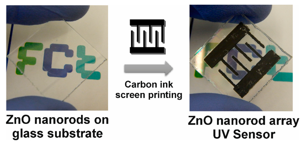 Several factors may be responsible for the high values obtained for decay time, such as the annealing temperature, the thickness of nanorods and even the type and design of electrical contacts that are used. For this sort of sensors, as the main goal is to use low cost techniques, the contacts used were based of carbon ink and deposited by screen printing technique. In such approach, only part of the nanorods (the top) is kept in contact with the ink (that is not so conductive as an aluminum or silver contact). This can lead to the photogenerated carriers to be kept trapped within the ZnO nanorods for longer period of time before being injected into the carbon contacts, and thus leading to a slow saturation in photocurrent and slow decay when the UV radiation is turned off [50]. This may be the probable cause of having sensors with a long decay response. The layout of the contacts can be improved in order to reduce the UV sensor decay time.
