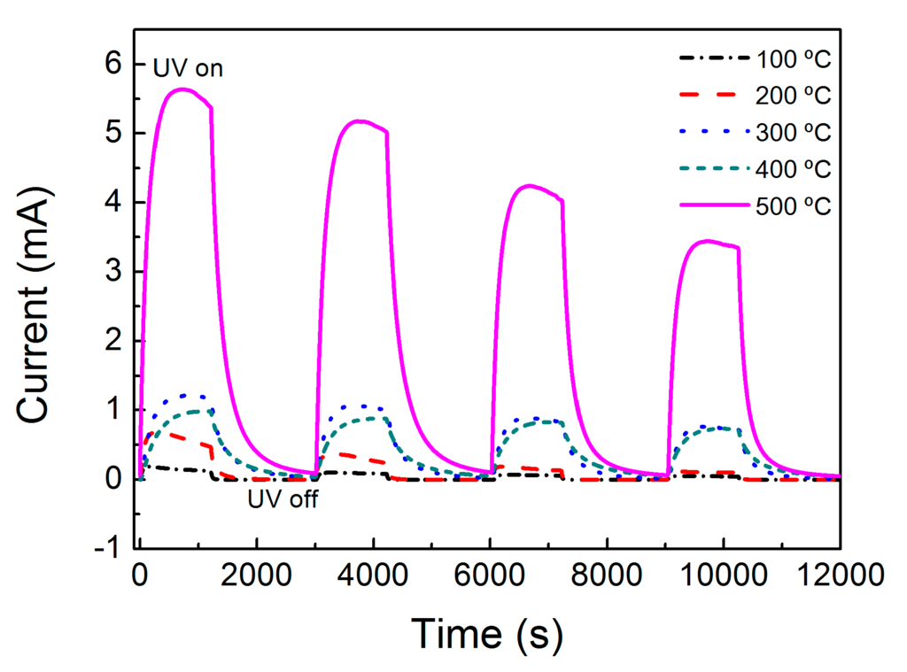 Figure 8 shows the time resolved photocurrent of ZnO nanorods UV sensor, produced with different annealing temperatures, in response to turning on/off the UV radiation, at room temperature. It can be seen that the ZnO nanorods array sensor produced with an annealing temperature of 500 °C displayed enhanced sensing performance. Under the bias voltage of 5 V, the photocurrent exponential increased from 0.5 µA to 0.1 mA for the material with an annealing temperature of 100 °C and up to 5.5 mA for the one produced with an annealing temperature of 500 °C, within about 60 s, with saturation in the on-state. After the UV radiation was turned off, the current decreased again to the initial value of current.