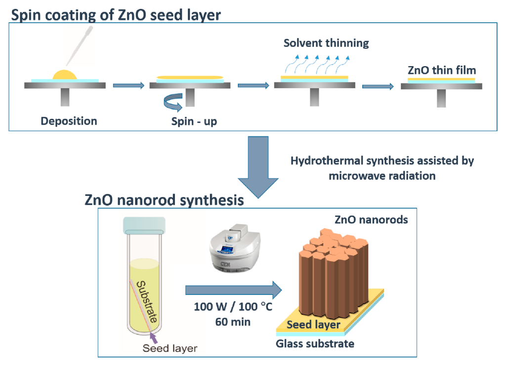 Scheme of the ZnO seed layer deposition using the spin coating method, followed by ZnO nanorod arrays synthesized by hydrothermal method assisted by microwave radiation.