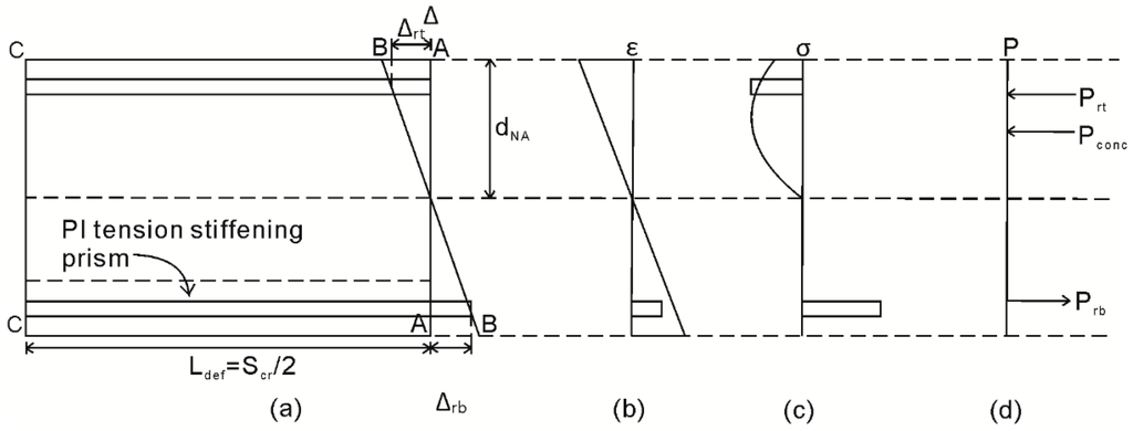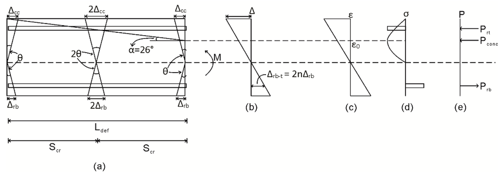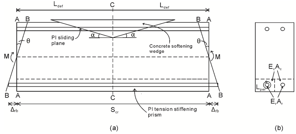 The rotation θ at the segment ends in Figure 1a is accommodated by an Euler-Bernoulli deformation from A–A to B–B such that plane sections remain plane. The total deformation from A–A to B–B must be accommodated by a combination of material extension and contraction and non-material deformations due to sliding; that is, by a combination of material strains and localized partial interaction slip behaviors. In the tension region, a partial interaction slip between the reinforcement and the concrete, shown as Δrb in Figure 1a, takes place. This slip, and the associated loads in the reinforcement and concrete within the tension stiffening prism, defines the crack spacing, Scr in Figure 1a, as well as the crack widths 2Δrb both during crack opening and closing, as well as tension stiffening. In the compression region, slip along a concrete to concrete PI sliding plane in Figure 1a results in the formation of concrete softening wedges seen in practice [12,14,15,33,34,35].