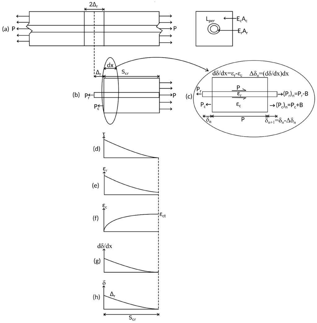 On initial axial loading P of the prism in Figure 4a that is prior to cracking, full interaction exists between the reinforcement and the concrete such that both the reinforcement and the concrete are uniformly extended. Following the formation of an initial crack, which occurs when the moment to cause cracking in the segment in Figure 1 is reached, a condition of partial interaction between the reinforcement and the concrete exists; that is, the reinforcement slips relative to the concrete resulting in a half crack opening Δr in Figure 4a,b.