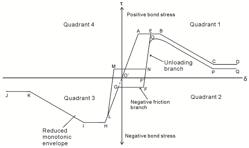 During initial loading along path OAB in Figure 9, that is prior to any load reversals taking place, the same numerical analysis technique applied to determine the crack spacing can be applied; that is, a single element of length dx extracted from the prism in Figure 7b is identical to that in Figure 4c. The analysis, therefore, proceeds by imposing a slip Δr at the loaded end in Figure 7b and follows the same iterative procedure outlined in the previous section using Figure 4b,c except that the boundary condition is no longer that of full interaction but that the slip half way along the prism is zero and that δ = 0 at Scr/2, as shown in Figure 7c. From this analysis, for an imposed slip Δr, the corresponding load Pr, the distribution in slip in Figure 7c, the distribution of bond stress in Figure 7d, and the reinforcement strain in Figure 7e can be determined.