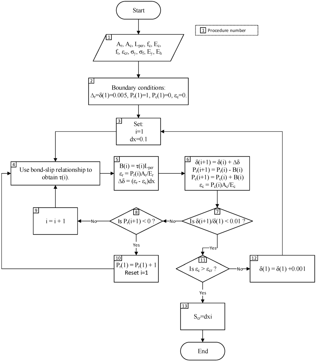 The numerical process to determine the primary crack spacing, Scr is as shown below. The tension stiffening prism is first divided into small segments of length dx. A flowchart on the steps required is given in Figure 6. The analysis steps are as follows: