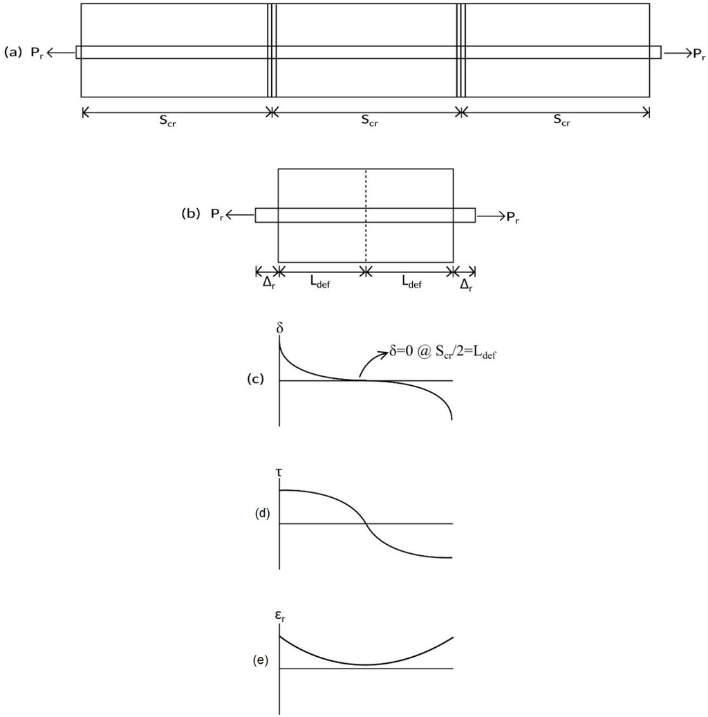 Once primary cracks have formed, the PI mechanism changes from that in Figure 4a where a single crack is considered to that in Figure 7a where the prism has multiple cracks. Having been extracted from the constant moment region in Figure 1a, the prism is symmetrically loaded. Hence, as in Figure 7b, by symmetry the slip at the midpoint of each prism must be zero as in Figure 7c; that is, δ = 0 at Scr/2 from the crack face. This is the boundary condition for the symmetrically-loaded prism in Figure 7b which is in contrast to that with an initial crack in Figure 4b where the boundary condition is that of full-interaction.
