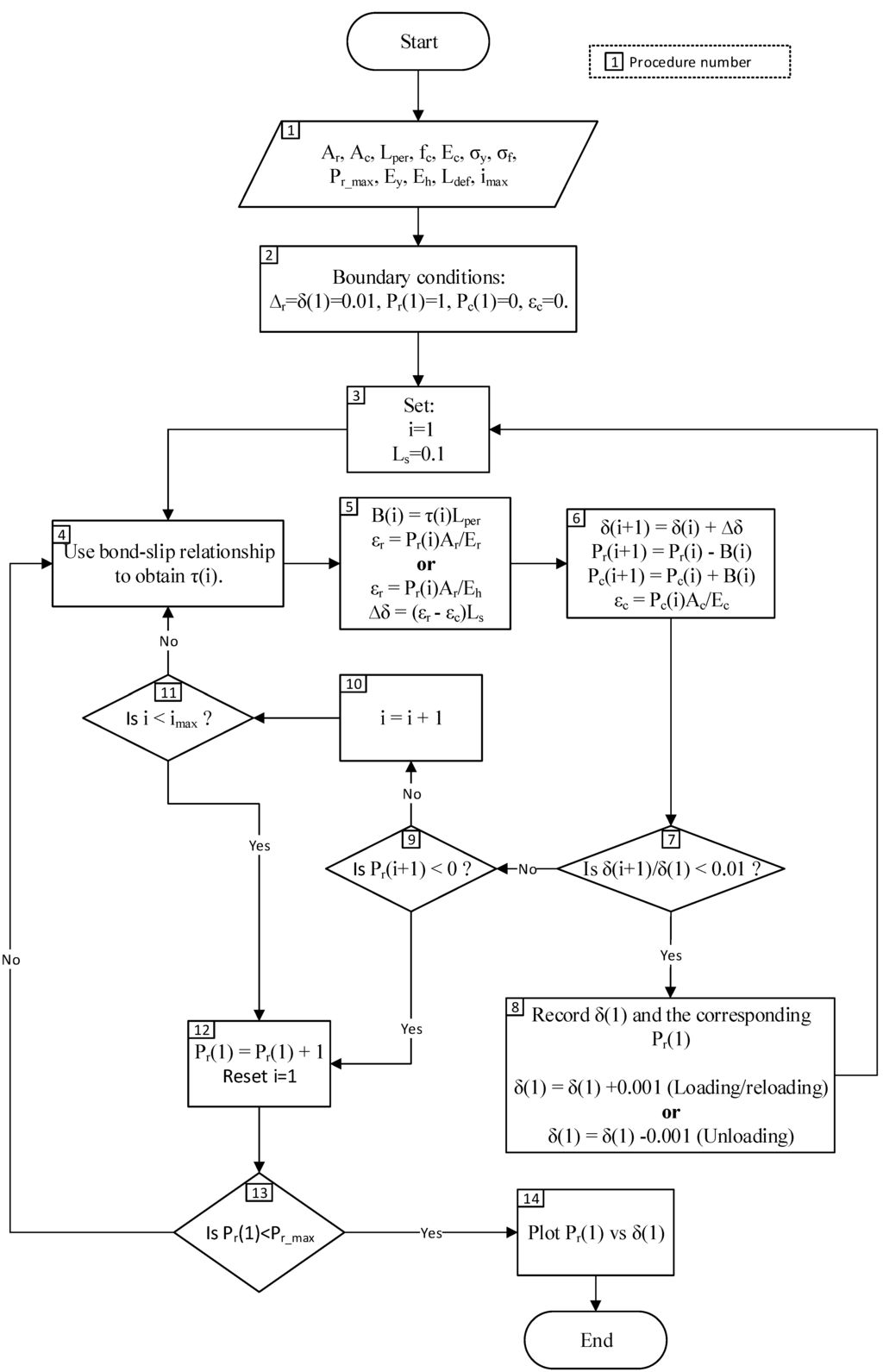 It is now a matter of determining the relationship between the load Pr and the slip Δr shown in Figure 7 which is required for the segmental analysis in Figure 3. A flowchart on the steps required for the tension stiffening analysis is given in Figure 8. The analysis steps are as follows: