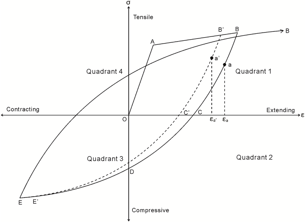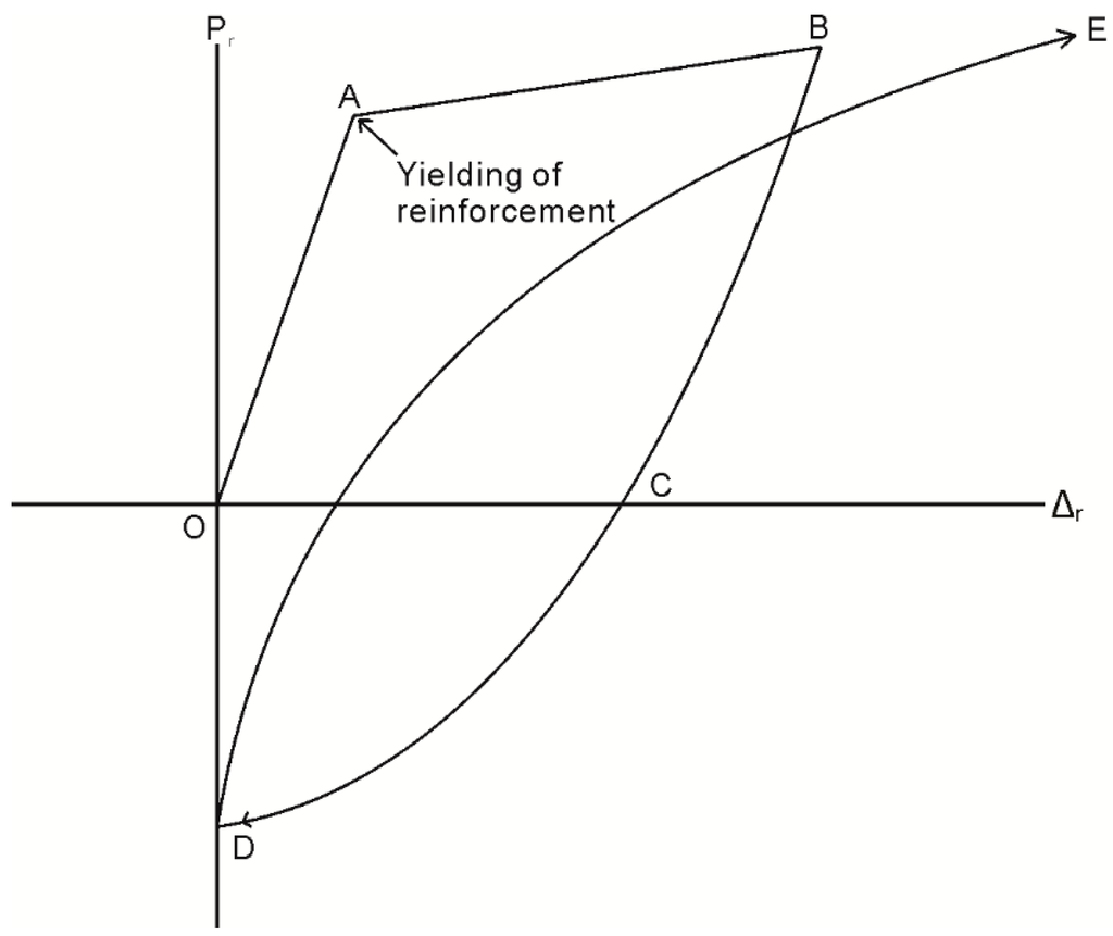 Unique to the initial loading case, the material constitutive relationships are restricted to the monotonic behavior; that is, the bond τ/δ relationship as defined by path O’ABCD in Figure 5, and the reinforcing σ/ε relationship used to determine the reinforcement strain is restricted to path OAB in Figure 10. Upon unloading from point B in Figure 9, the Pr/Δr relationship is strongly dependent on the load history of the local τ/δ bond properties, as well as the σ/ε relationship of the reinforcement. This dependency is a result of the inconsistencies in the signs of the τ/δ and σ/ε relationships which arise due to cyclic loading. By this it is meant that it is possible to incur increases in shear stress associated with a reduction in slip; that is, the negative friction branch F–G in the second quadrant of Figure 5. Moreover, it is possible for reinforcement to develop a compressive stress with an extending strain, for example along path B–C in the second quadrant of Figure 10. To show the influence of the cyclic τ/δ and σ/ε material properties, the mechanics of tension stiffening when unloading is now considered in two distinct phases defined by the reinforcement σ/ε behavior.