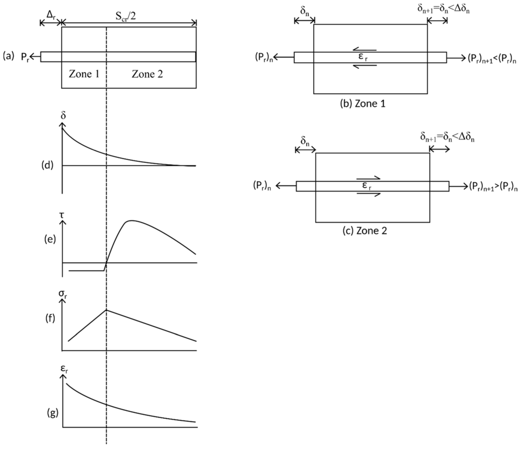 - The bond force is determined as B(i) = τ(i)Lper. Strain of the reinforcement bar is determined as εr = Pr(i)Ar/Er. The change in slip is then determined as ∆δ = (εr − εc)dx.