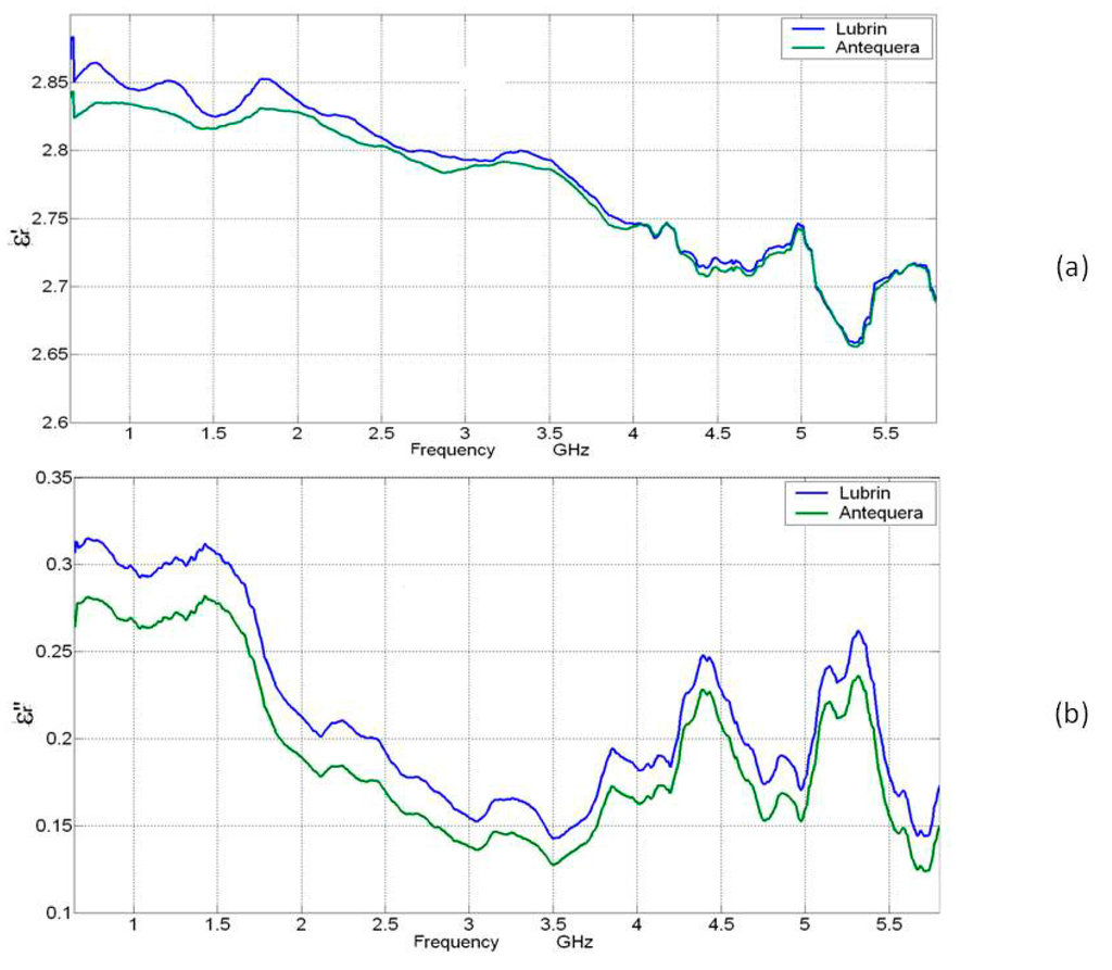 Relative permittivity behavior of the Lubrin and Antequera oil of the “Picual” variety type. (a) Dielectric constant (ε’); (b) loss factor (ε”).