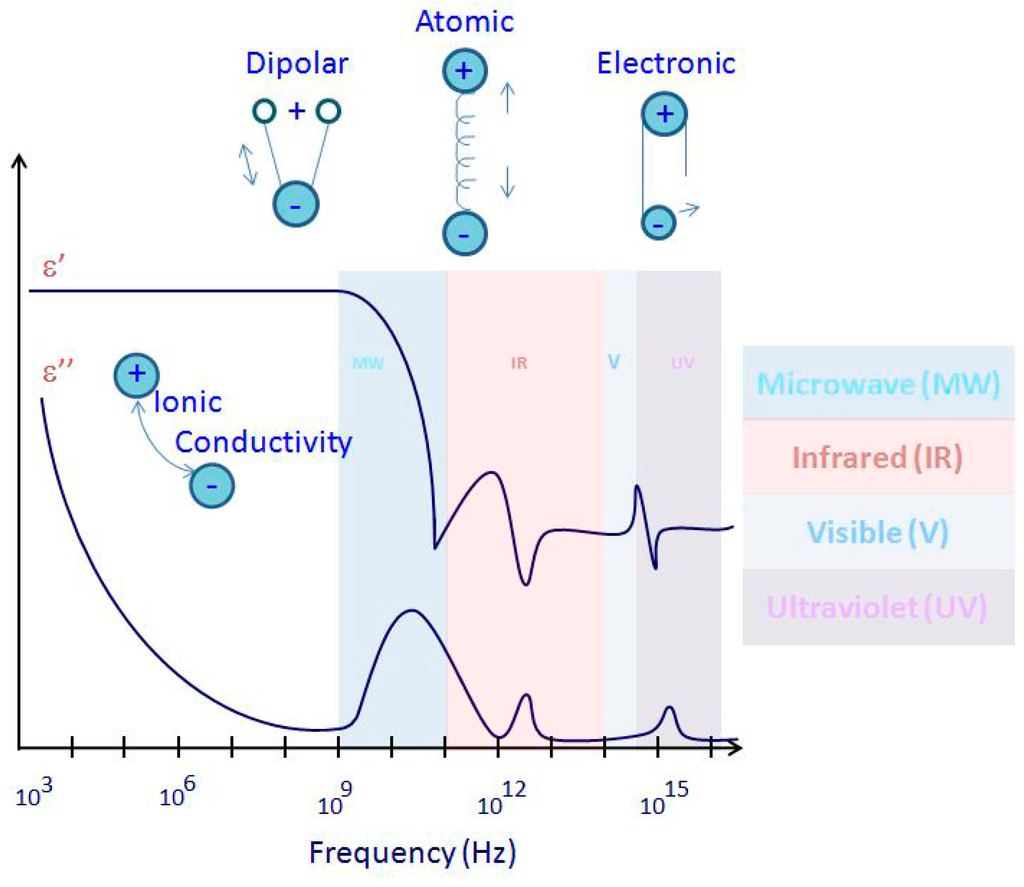 Electronic polarization occurs in atoms where electrons can be displaced with respect to the nucleus. In atomic polarization, the atoms can be moved in crystals or molecules. When they are present together, electronic and atomic polarizations give the material a lossless MW frequency and give the solids a permittivity in the order of less than 10. Atomic or vibration polarization is closely related to electronic polarization. However, the resonant frequencies of atomic polarization are lower due to the greater mass to be moved. Electronic polarization is found to be on the optical band, while atomic polarization is found on the infrared band, as seen in Figure 2 [13]. The dipoles try to follow a rapid changing field in MW or high-frequency fields. Therefore, the energy is lost to the random thermal motion of the water equivalent to a temperature rise known as orientation polarization, where ions move in the direction of the electrical field transferring energy [18,19]. The change accumulation at the surfaces between the materials with different electrical properties (interfacial polarization) and dipole orientation are the major effects behind the polarization.