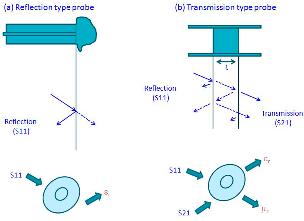 For the spectrum of liquids, biological materials and multiphase mixtures, a commonly used instrument for the measurement of the complex dielectric permittivity at the frequency range from 0.2 to 50 GHz is the open-coax probe of type 85,070 from Agilent [4]. With the VNA comes an accessory: a probe with specialized software. The surface of contact between the probe and the tested material can be expressed by the measurement of the S11 reflection parameter. A phase shift is designated by the reflected signal of the probe and the incident signal of the VNA. The ratio of the magnitude change and this phase shift is referred to as the S11. The illustrations of these measurements are shown in Figure 4, which highlights the difference between the reflection and transmission types of probes. For the user to acquire real and imaginary parts of the dielectric permittivity of the material, some typical models are incorporated in the supplied software. Instead of the expensive 85070E probe, some other subminiature version (SMA) coaxial connectors, or a modified type N, can be used for more economical solutions. These can perform correctly up to several GHz frequencies [69,70]. On the other hand, the S21 parameter, which is the ratio of the transmitted signal through the tested material to the incident one, can be measured using coaxial transmission lines or wave waveguides. In fact, the S21 parameter, when interpreted, allows for determinations of the complex dielectric permittivity and the magnetic permeability of a sample (Figure 4) [71,72,73].