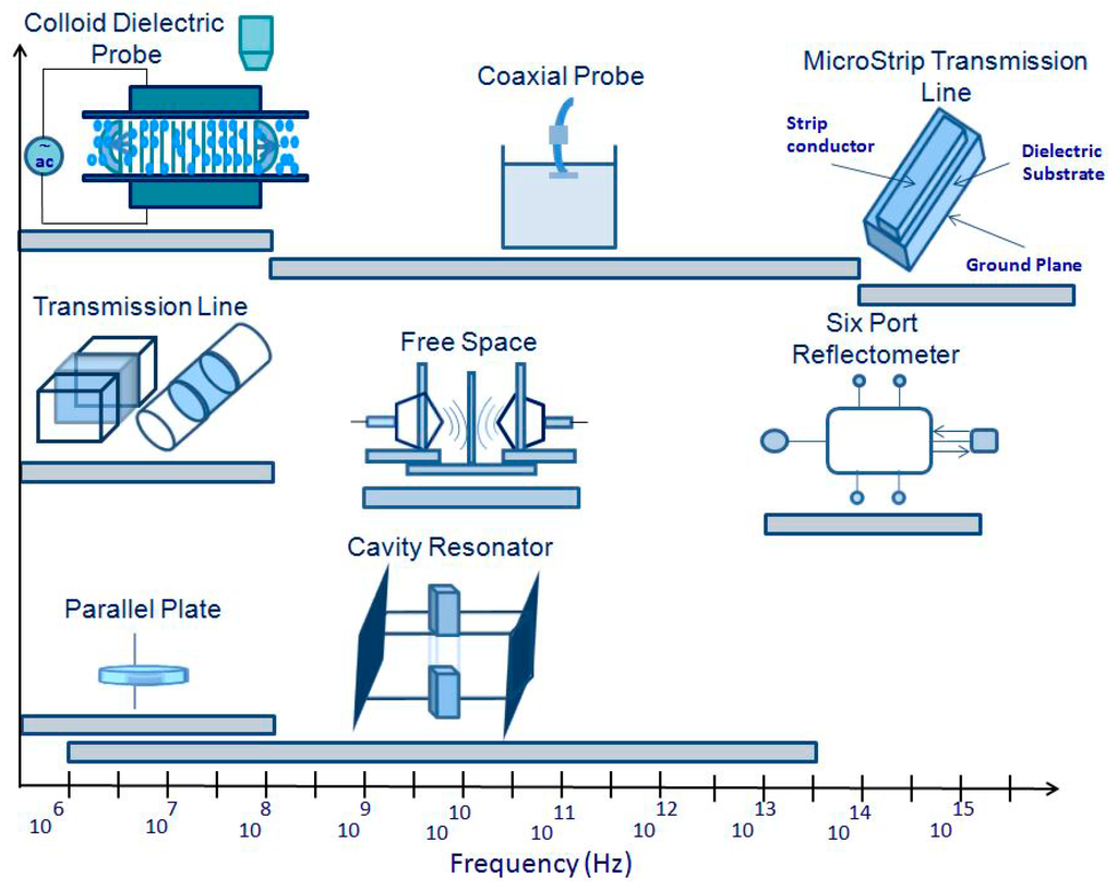 Due to the non-destructive monitoring of some specific materials properties, the measurement of dielectric properties is gaining more importance. These measurements are finding increasing application as new electro-technology become more adapted for agricultural use and the food-processing industry. Venkatesh and Raghavan [64] have completed a comprehensive overview of the different measuring techniques. In the MW region, the dielectric properties of food can be determined using different MW measuring sensors. Measurement techniques used for the sensing of the properties of materials samples can be categorized either as reflection or transmission types, using resonant or non-resonant systems, with open or closed structures [24]. While the waveguide and coaxial line are under transmission measurement and present closed structures, the free space transmission measurement and open-ended coaxial line system are open-structure techniques. The most practical methods appear to be the ones that utilize the measurement of the dielectric properties and the agri-food products of the grain [97]. These techniques include waveguide measurements, resistivity cell, parallel plate, lumped circuit coaxial probe transmission line, resonant cavity, free space, parallel plate capacitor, cavity resonator, and time domain spectroscopy, each having unique advantages and disadvantages [13,98]. Since they were only used for high loss materials and low frequencies, the lumped circuit techniques are no longer used.