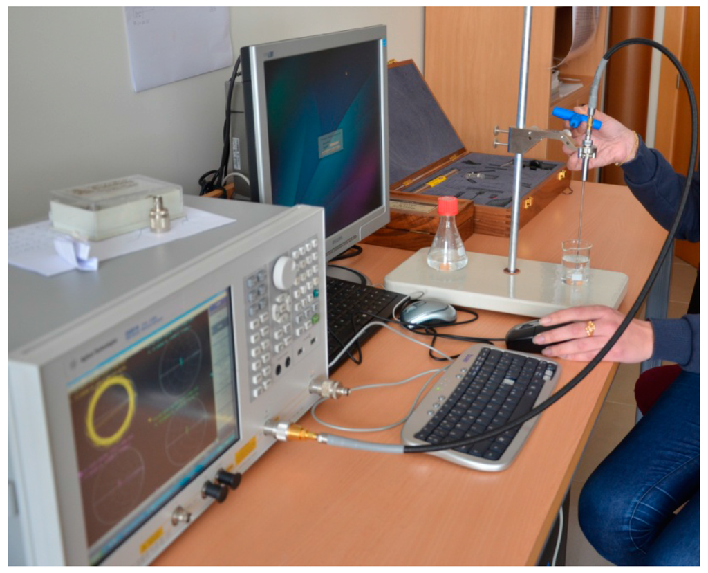 The VNA (such as in the case of the Rhode and Schwarz) generates, at the reflective mode of work, a sine wave signal in a broad frequency range from 20 KHz to 8 GHz. At this point, the separation occurs between the incident and the reflected signal [74]. In fact, the dielectric properties of the material determine the phase and the amplitude of the signal reflected from the probe. On the basis of the theoretical models that describe the probe in a dielectric medium, the frequency spectra of the dielectric constant and loss factor ε´(f) and ε´´(f) can be calculated respectively. For liquids with commonly known ε*(f) characteristics [75], some numerical calculations are required in addition to the calibration measurement of the objects. A necessity that must be stressed here is that the application of high-frequency fields is required for the measurement of the real part ε´(f) of ε*(f). In addition, the elements of the measuring system must be treated as a distributed parameter system [76].