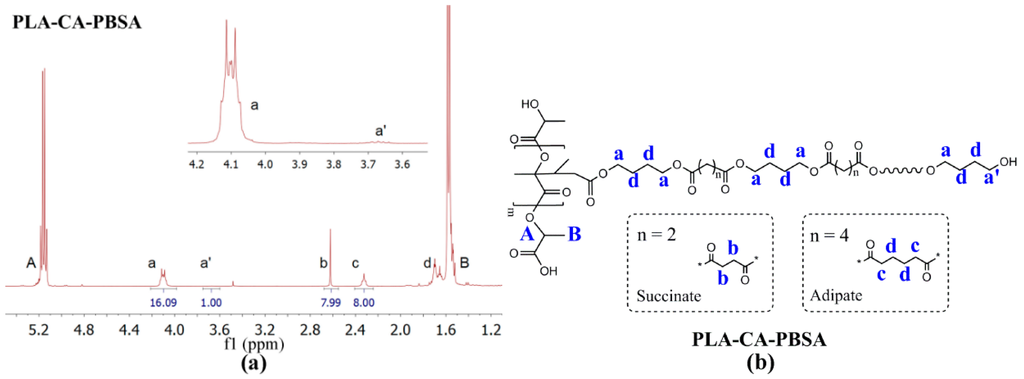 (a) 1H NMR spectrum of PLA-CA-PBSA; (b) The peak assignment for the structure.
