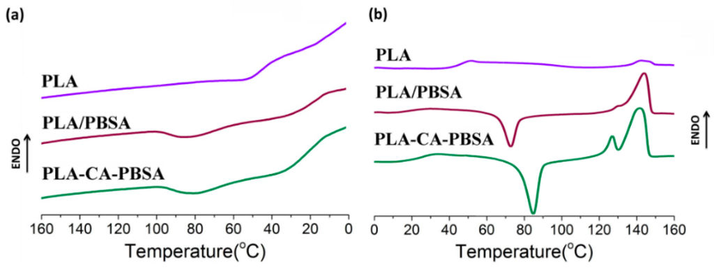 DSC trace of PLA, PLA/PBSA and PLA-CA-PBSA during (a) cooling and (b) second heating scan.
