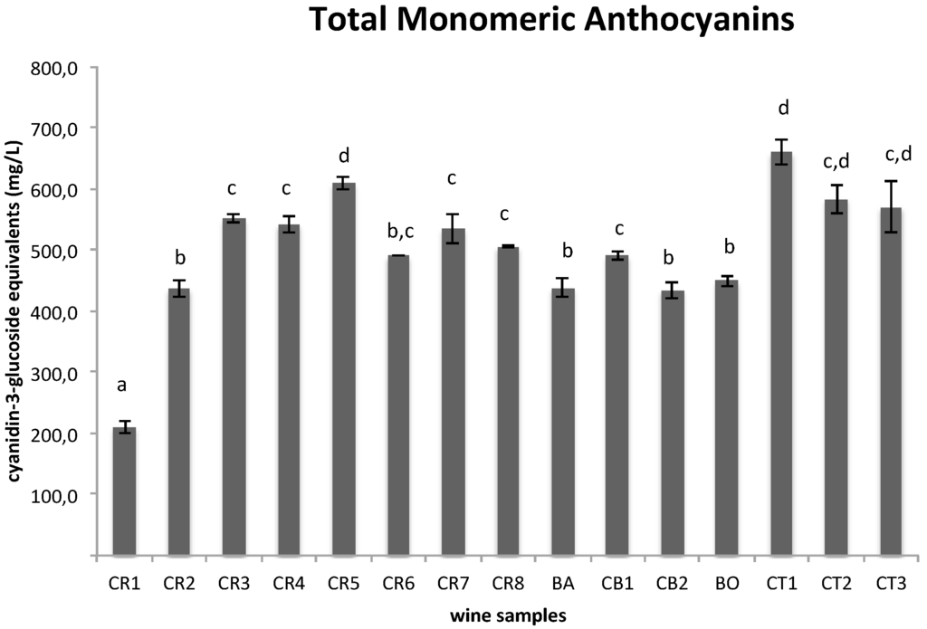 Total monomeric anthocyanin content of the 15 wine samples obtained by pH-differential method assay. Data (mg/L CGE) are expressed as the mean ± SD (n = 3); different letters indicate statistically significant differences (p < 0.05) between samples.