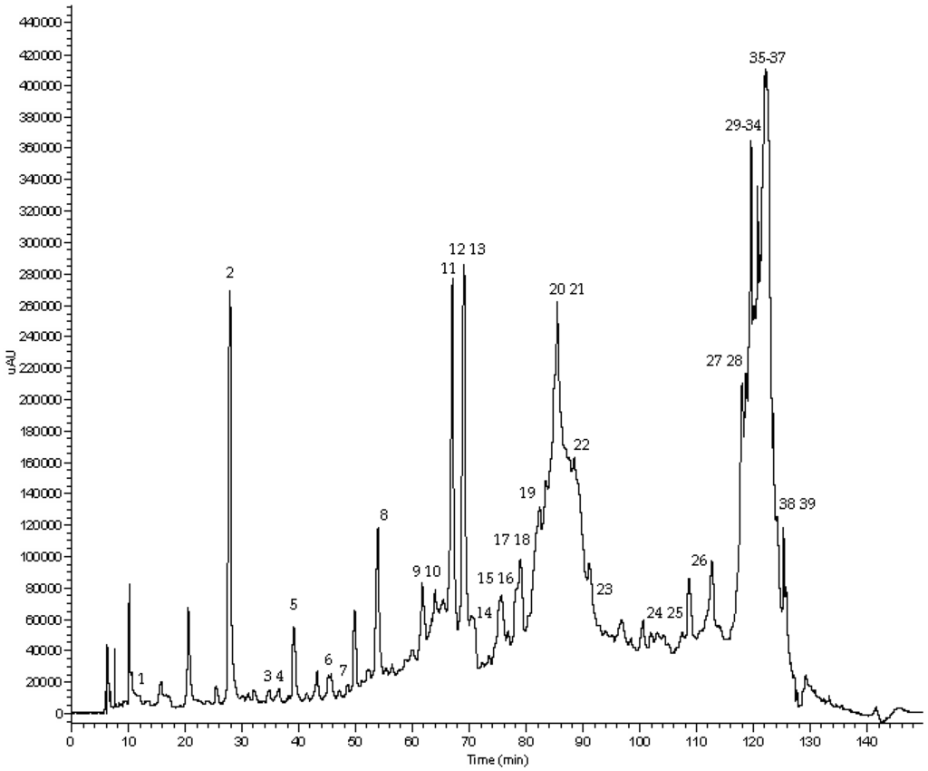 RP-HPLC-DAD-ESI-MSn analysis revealed the presence of 39 compounds, listed in Table 2, that were identified according to their chromatographic behavior, their UV-Vis, MS and MS2 spectra, when compared with literature data. As an example, we reported the chromatographic profile, acquired at 280 nm, of sample CR5 (Figure 3).