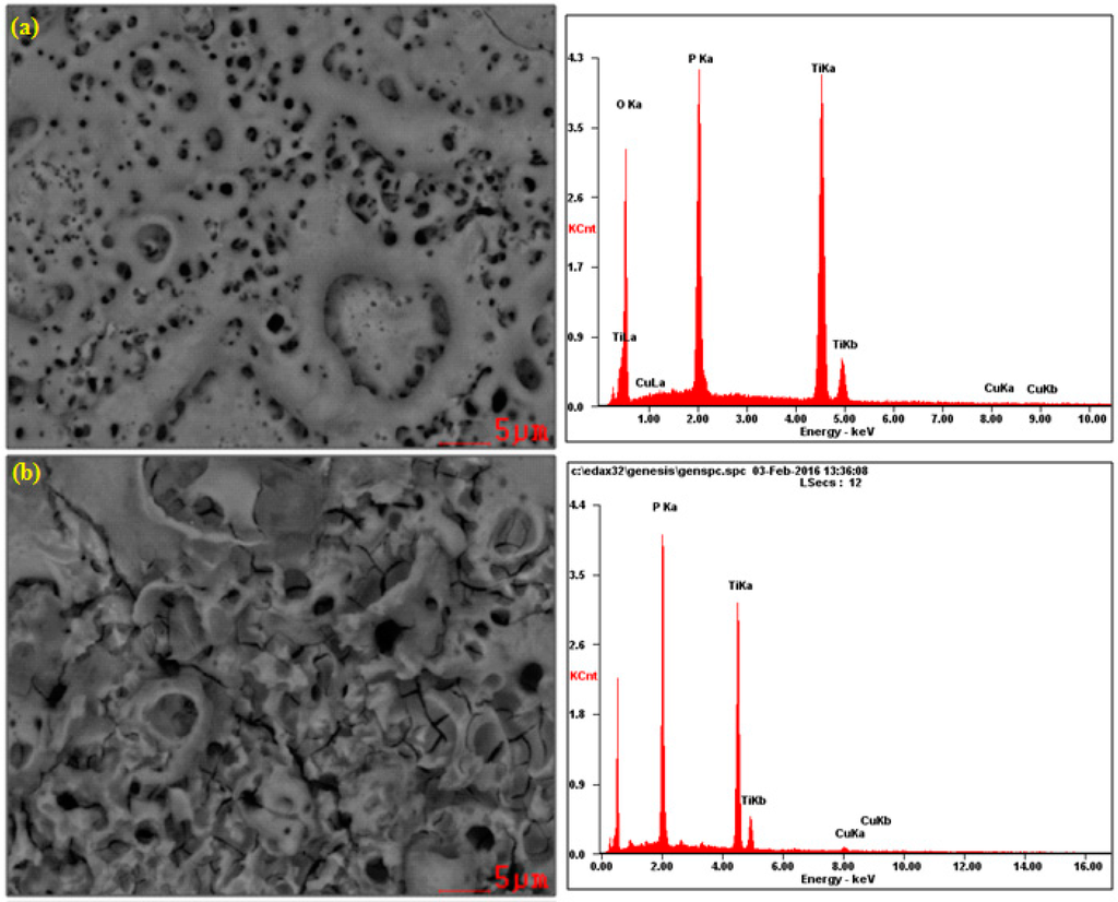 The authors have also calculated the Cu/P, Cu/Ti and P/Ti ratios, and they are presented in Table 6. The PEO layer has been characterized by the dimensionless numbers. This is important because they can be used for the comparison of other surface layers containing phosphorus and copper incorporated.