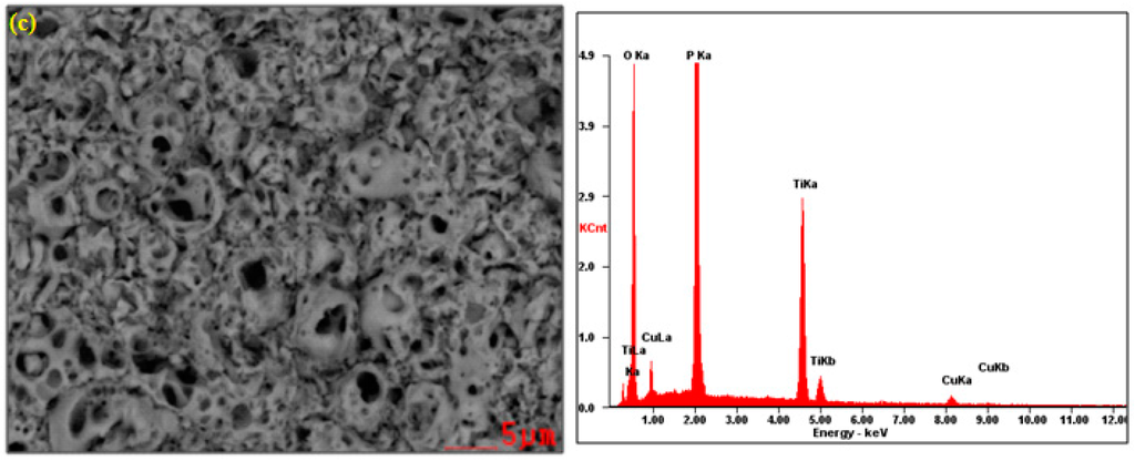 In Figure 1, the SEM and EDS results of the surface layer formed on titanium after PEO at the voltage of 450 V in electrolyte consisting of 1 L H3PO4 with the addition of (1) 10 g/L; (2) 300 g/L and (3) 600 g/L of Cu(NO3)2 are presented. All SEM photos show that the obtained surfaces are porous. Additionally, on the surface treated in the electrolyte consisting of 300 g/L of copper nitrate, the cracks in the surface layer are visible beyond the pores, which may be indicative of too rapid growth in volume of the layer. Interestingly, the increasing of the copper nitrate up to 600 g/L does not result in such cracks. Most likely, the copper ions inserted in the porous phosphorus-oxygen-titanium structure create the original modified surface layer. On the basis of EDS peaks, it can be concluded that, with the increase of copper nitrate in concentrated phosphoric acid, the amount of titanium in the surface layer decreases, whereas the increase of phosphorus and copper amounts is observed.