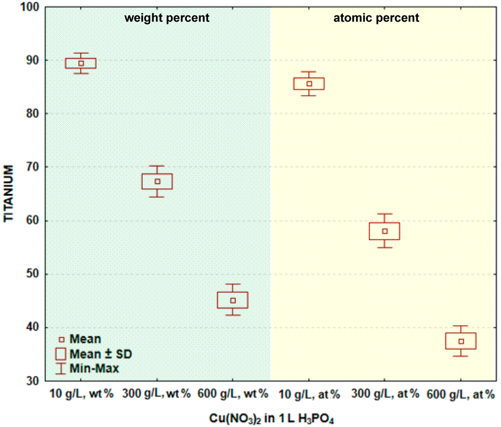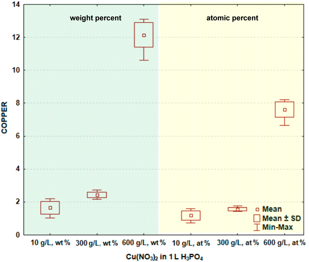 In Figure 2 and Table 1, the box and whisker plots with the descriptive statistics of the amount of copper in the surface layer formed on titanium after PEO are presented, respectively. One may notice that the copper amount in the surface layer increases with increasing the content of copper nitrate in the electrolyte. The minimum amount of copper in the surface layer was detected after the PEO performed in the electrolyte containing 10 g/L Cu(NO3)2 and was equal to 1.7 ± 0.4 wt % (1.2 ± 0.3 at %), and the maximum was found in the electrolyte containing 600 g/L Cu(NO3)2 in H3PO4, and equaling 12.2 ± 0.7 wt % (7.6 ± 0.5 at %). The significance tests in Statistica software (Version 10) [39] for all data were performed and show that the amounts of copper in the surface layer formed on titanium after PEO in the electrolytes containing various amounts of copper nitrate belong to different data populations. Therefore, it is possible to conclude that there are significant differences in the copper amount in the passive layer between the treated samples.