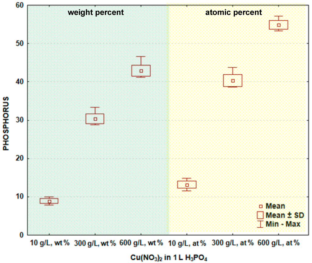 In Figure 3 and Table 2, the box and whisker plots with the descriptive statistics of the amount of phosphorus in the surface layer formed on titanium after PEO are shown, respectively. It is visible that the phosphorus amount (similar as copper) increases with the increase of the copper nitrate in the electrolyte. The minimum amount of phosphorus in the surface layer was detected after the PEO performed in the electrolyte containing 10 g/L Cu(NO3)2 and was equal to 8.9 ± 0.6 wt % (13.2 ± 0.9 at %), and the maximum was found for 600 g Cu(NO3)2 in 1000 mL H3PO4, equaling 42.9 ± 1.4 wt % (54.9 ± 1.1 at %). The significance tests presented in Table 2 show that the amounts of phosphorus in the surface layer formed on titanium after PEO in the electrolytes containing various amounts of copper nitrate belong to different data populations. Following that, it is possible to conclude that there are significant differences in the phosphorus amount in the passive layer between the treated samples. The study shows that the increasing concentration of copper nitrate in the phosphoric acid results in the increase of both copper, as well as phosphorus in the surface layer. These phenomena can be explained by the formation of chemical compounds between titanium, phosphorus, copper and oxygen, which are insoluble in the concentrated phosphoric acid.