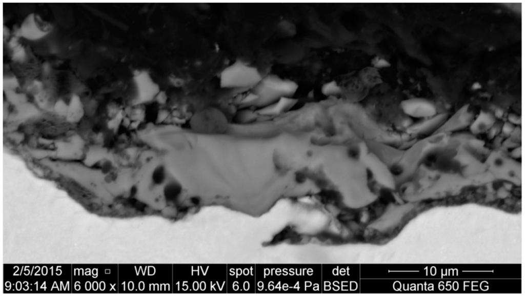 For example, Figure 5 presents a cross-section of the surface layer obtained on pure titanium after PEO at the potential of 450 V in the electrolyte consisting of 300 g of copper nitrate dissolved in 1000 mL of concentrated phosphoric acid (98 g/mol). One may easily notice that the obtained surface layer is heterogeneous and porous, and its thickness is equal to about 10 μm. Additionally, one may presume that it is more biocompatible than a pure titanium surface and can be used as a transition layer between the titanium biomaterial and tissue.
