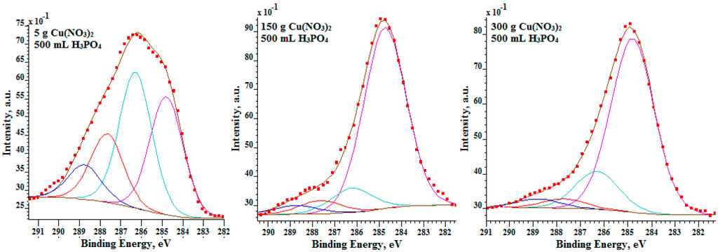 In the case of a low signal-to-noise ratio, i.e., three for nine sweeps (Figure 8), the authors decided to repeat XPS high resolution scans for the Cu 2p3/2 region with 36 sweeps (signal-to-noise ratio equals six). Based on the obtained results, which are depicted in Figure 8, it should be noted that for the lowest amount of copper nitrate (10 g/L) in phosphoric acid, the signal is still very noisy; hence, it was not possible to perform the correct fitting.