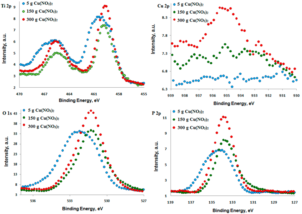 The XPS measurements on oxidized titanium samples were performed by means of the SCIENCE SES 2002 instrument (SCIENTA AB, ScientaOmicron, Uppsala, Sweden) using a monochromatic (Gammadata-Scienta) Al Kα (hν = 1486.6 eV) X-ray source (18.7 mA, 13.02 kV). Scan analyses were carried out with the measurement area of 3 × 1 mm2 and a pass energy of 500 eV with the energy step of 0.2 eV and the step time of 200 ms. The binding energy of the spectrometer has been calibrated by the position of the Fermi level on a clean metallic sample. The power supplies were stable and of high accuracy. The experiments were carried out in an ultra-high-vacuum system with a base pressure of about 6 × 10−10 Pa. The XPS spectra were recorded in normal emission. For the XPS analyses, the Casa XPS 2.3.14 software (Shirley background type [11]) was used. All binding energy values presented in this paper were charge corrected to C 1s at 284.8 eV. All XPS spectra of titanium (Ti 2p), phosphorus (P 2p), copper (Cu 2p), as well as oxygen (O 1s) and carbon (C 1s) with 9 sweeps were performed. Additionally, for the copper Cu 2p spectra, the measurements were repeated by 36 sweeps to increase the signal-to-noise ratio to 6. For the interpretation of the deconvoluted spectra, the literature positions [40,41] were applied.