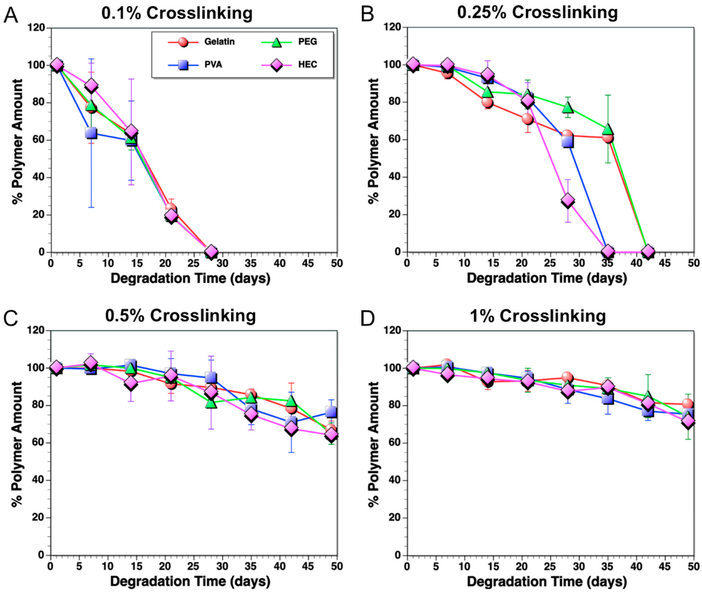 The swelling rate of the IPNFs was also studied (data not shown). Under identical conditions, PVA- and HEC-based IPNFs swelled significantly more than PEG IPNFs and gelatin films. The difference of the chemical structure and the hydrophobicity of the polymers might be the reason of this observation. However, this difference in swelling did not translate to differences in complete degradation times, especially in case of 0.1 vol % and 0.5 vol % GA cross-linked IPNFs. Interestingly, PVA and HEC IPNFs cross-linked using 0.25 vol % GA degraded over a period of time almost one week shorter than their PEG and gelatin counterparts. This could be due to the differences in the chemical structures and functional groups of the polymers. Although, the more hydrophilic compounds are expected to be more water-soluble, stronger interactions of the functional groups of gelatin may cause less degradation.