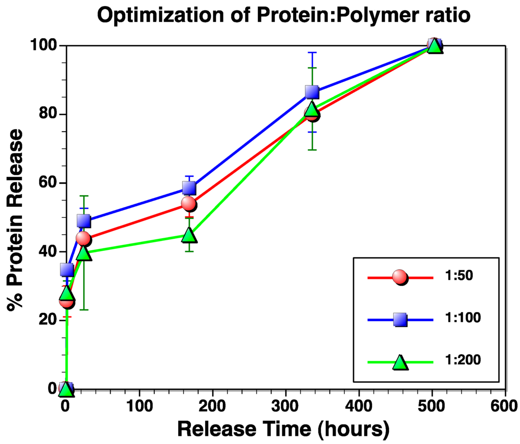 Optimization of protein loading. All polymer films were cross-linked with 0.25 vol % GA. Release rates were similar even in the case of different protein to polymer loading ratios.