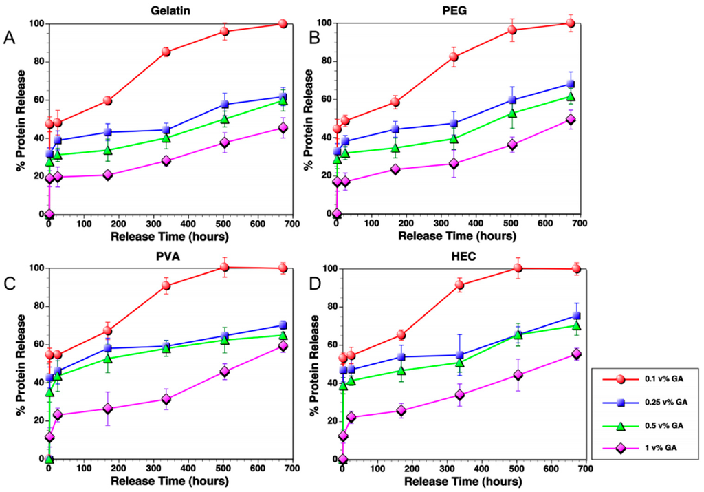 The release of proteins from the IPNFs depends on their dissolution rates. It is expected that IPNFs with higher GA cross-link density would dissolve slower and, hence, be more suitable for long-term release of proteins as opposed to IPNFs with lower GA cross-link density. However, a harsh cross-linker like GA forms strong covalent bonds between the host matrix and load (drug or protein). Such chemical bonds decrease the effectiveness of the load by changing their chemical nature [50,51,52]. To overcome this problem, we designed a unique method for fabrication of core-shell IPNFs, as presented in Figure 1. In this method, we mixed the protein with gelatin-based IPNF and encapsulated this mixture in between two protein-free, polymer-enhanced IPNF to form an IPNF pellet. We then dipped this pellet into the GA solutions at a low temperature to form an outer cross-linked shell (shown in red in Figure 1). By this method, we prevented the direct contact of GA with proteins, which could result in denaturation and loss of therapeutic activity or immunogenicity. At the same time, we benefit from the extra cellular matrix-like structure of the gelatin-based film to load and retain the proteins for an extended time without losing the effect.