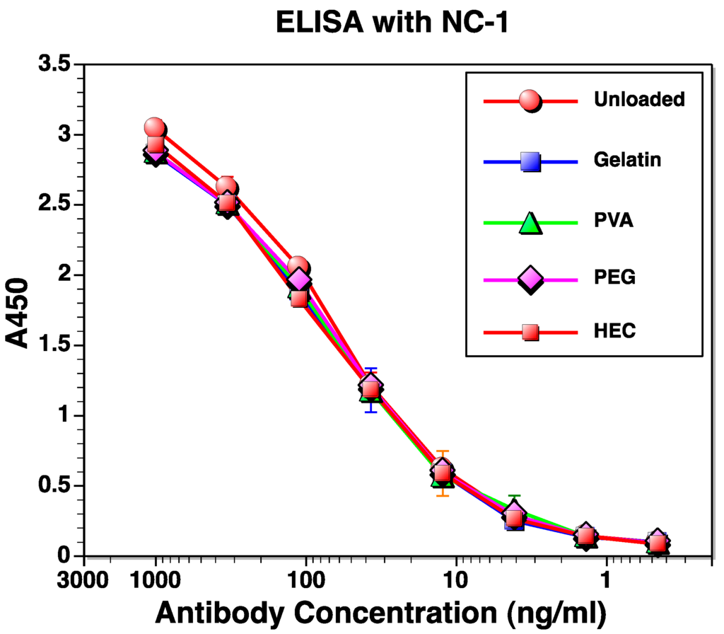 Maintaining their structural integrity upon release is a major criterion for biomolecules to allow retention of their functionality. The protein used in this study is a gp41-based HIV-1 envelope protein that has a unique six-helix bundle conformation. This conformation can be readily detected by mouse monoclonal antibody NC-1 using traditional ELISA [57]. We examined and compared the binding of this antibody to the released proteins and the unloaded NHS-labeled protein to confirm the structural integrity of the released proteins. As shown in Figure 5, the released proteins from different IPNFs showed similar binding efficiency as the unloaded protein. This suggests that the protein structure is conserved during the loading and release processes.