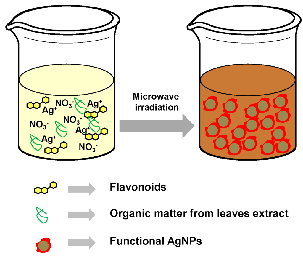 - Raghunandan, D.; Basavaraja, S.; Mahesh, B.; Balaji, S.; Manjunath, S.Y.; Venkataraman, A. Microwave-assisted rapid extracellular synthesis of stable bio-functionalized silver nanoparticles from guava (Psidium guajava) leaf extract. J. Nanopart. Res. 2010, 13, 2021–2028. [Google Scholar] [CrossRef]