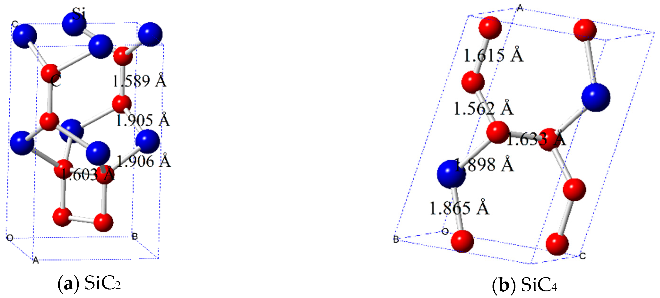 Unit cell crystal structures of SiC2 (a) and SiC4 (b).
