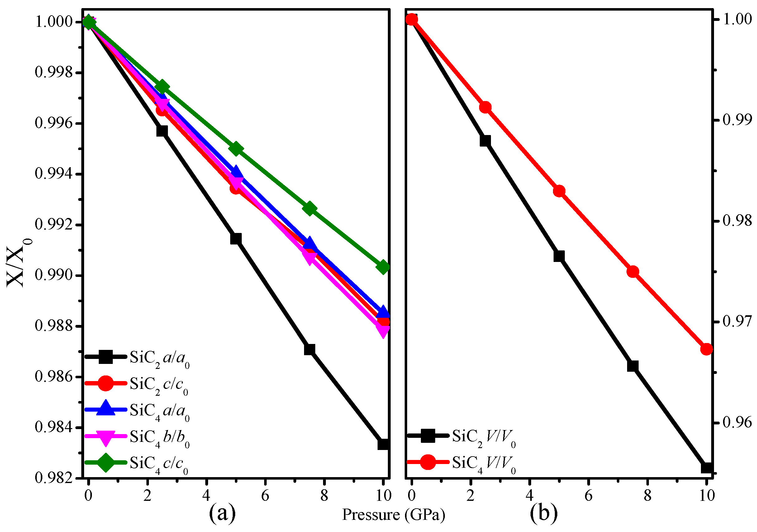 The compression lattice constants a/a0, b/b0, c/c0 as functions of pressure SiC2 (a) and SiC4 (b).