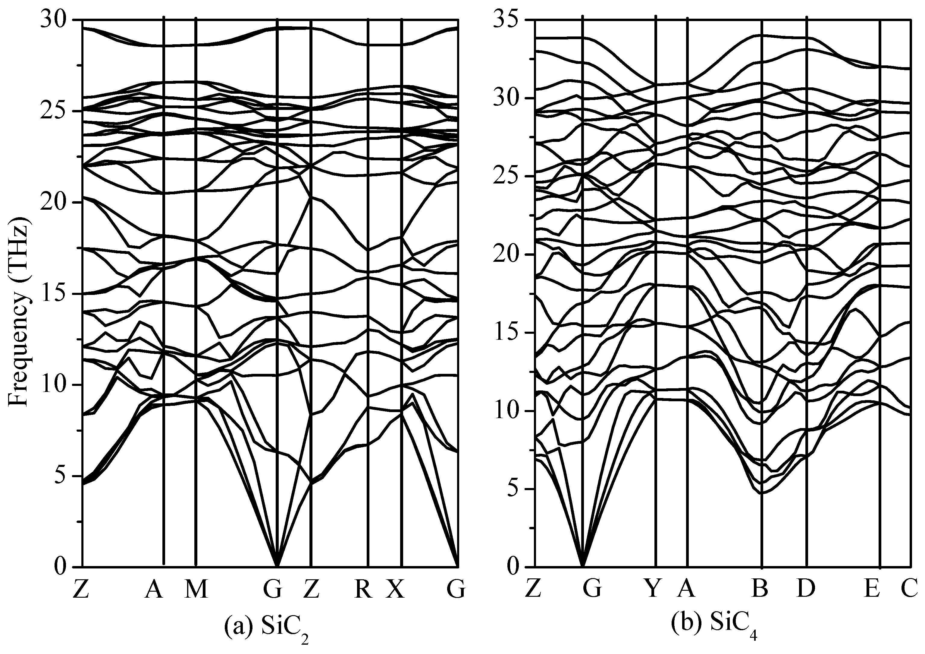 Phonon spectra for SiC2 (a) and SiC4 (b).