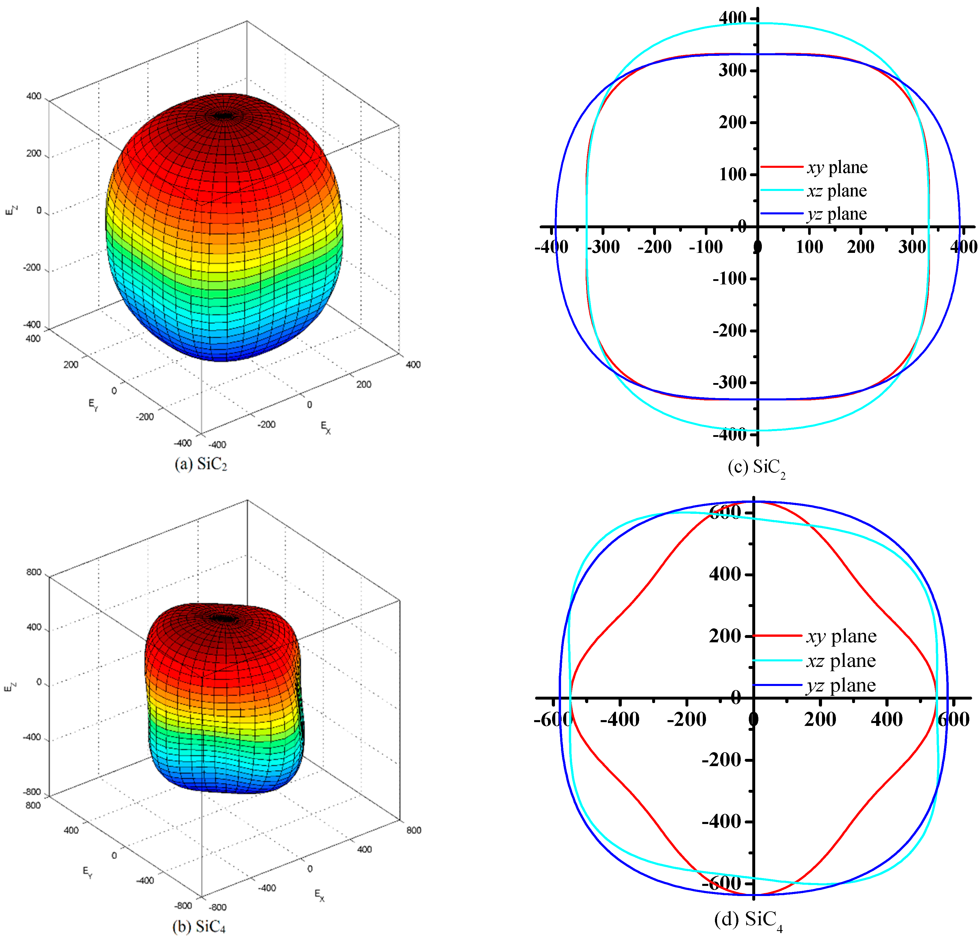 The directional dependence of Young’s modulus for SiC2 (a) and SiC4 (c); 2D representation of Young’s modulus in the xy plane, xz plane, and yz plane for SiC2 (b) and SiC4 (d).